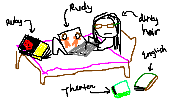 Me, catching up on Misfits while trying to do my last Ruby assignment (...the textbook reading about Rails has not helped me at all), instead of studying for my English/linguistics and theater finals. With dirty hair.