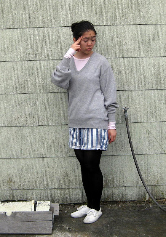 Sweater: uncle's, hand-me-down. Light pink thermal: Old Navy, gift. Shorts: aunt's, hand-me-down. Tights: generic. Fake Keds: Payless. Magneto helmet: MS Paint. Gaussian blur: image editing prowess.
