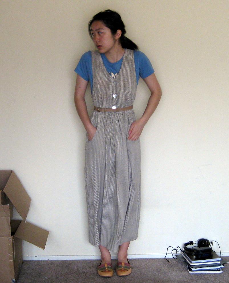 Above, dress: The Limited, mother's. Belt: thrifted. T-shirt: Secrets of Mensa via Threadless. Flats: Kork-Ease Isabel.