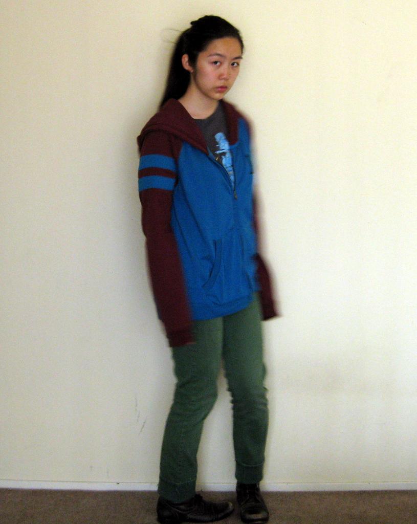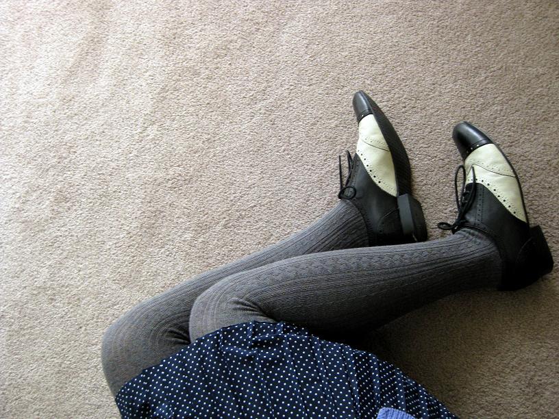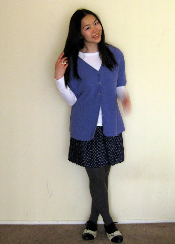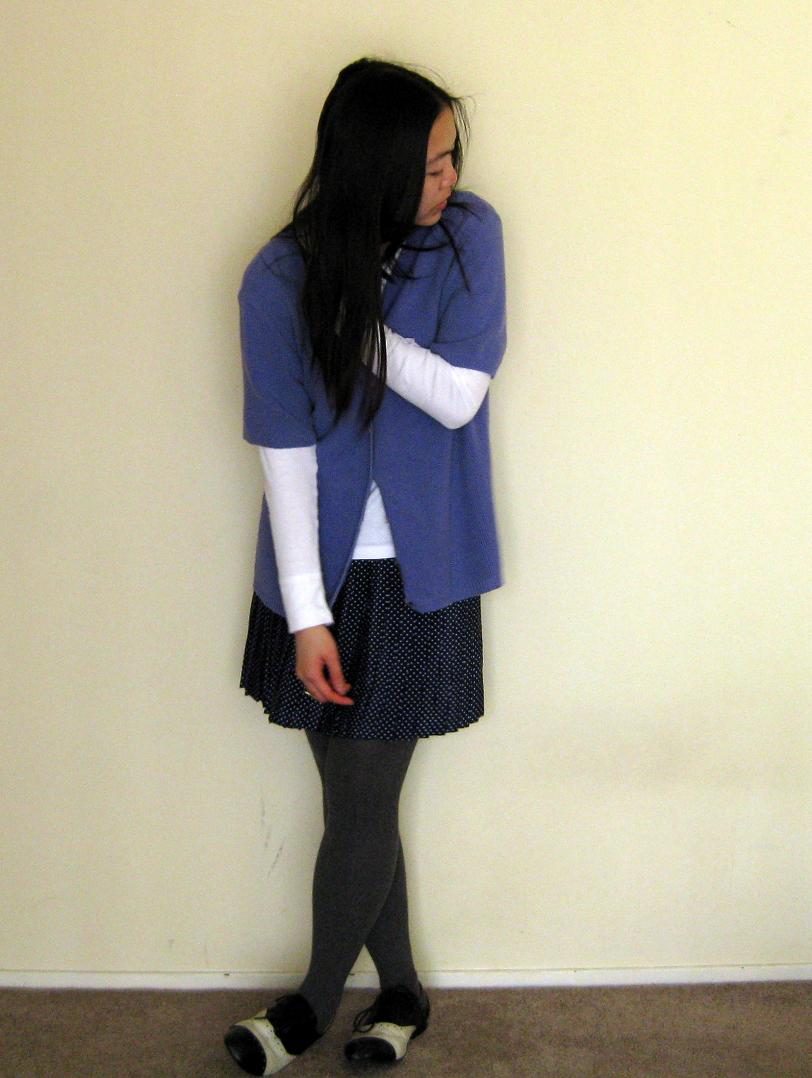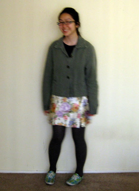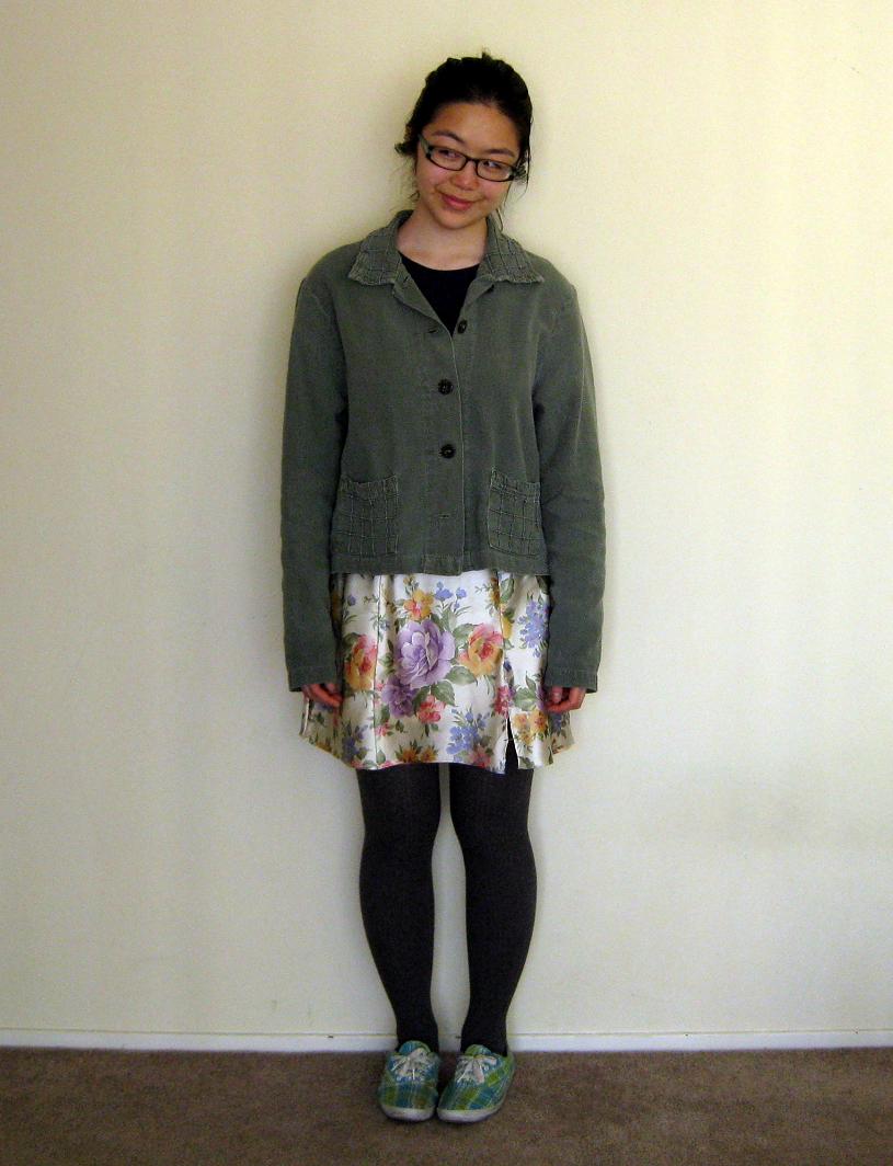 Jacket: mother's, either The Limited or Express. Shirt: probably Target. Floral slip: secondhand. Tights: gift from my brother. Shoes: Keds. |