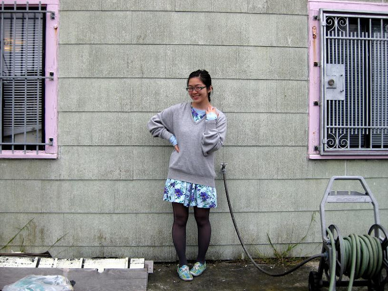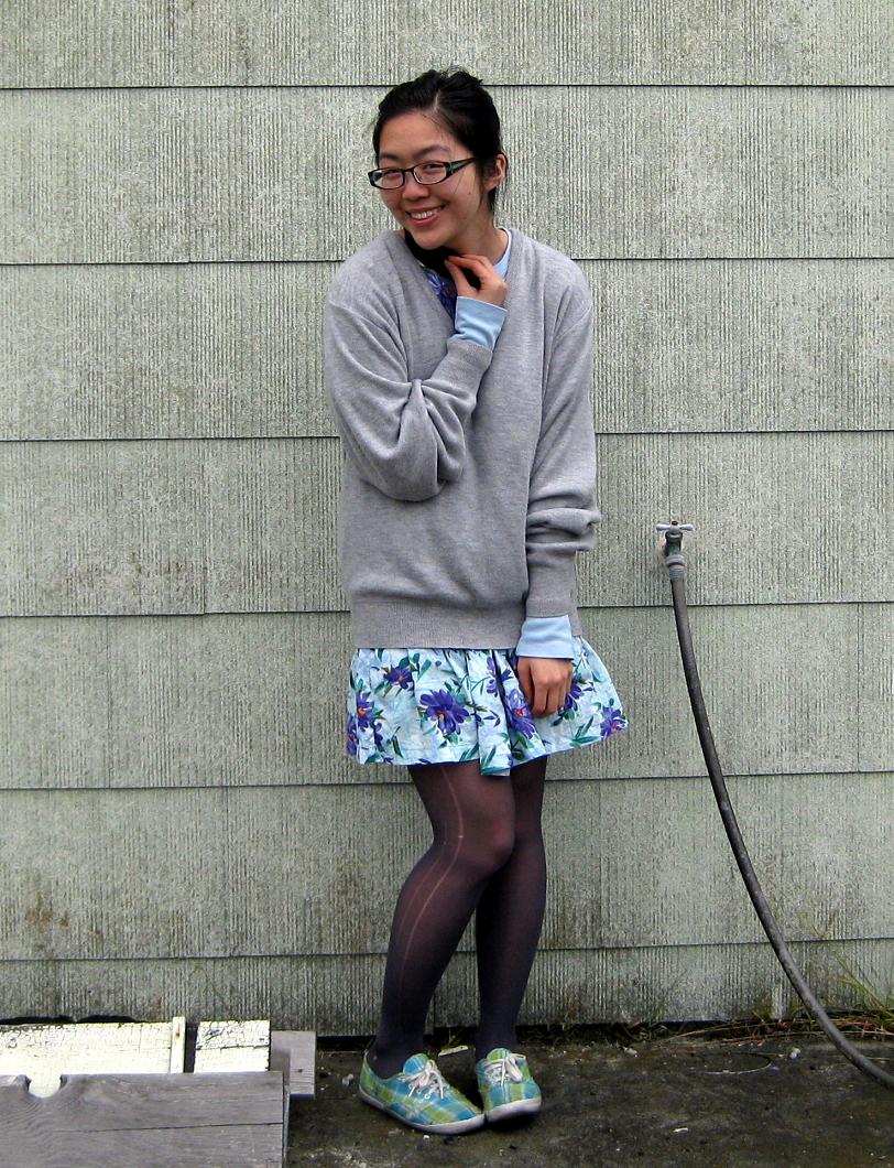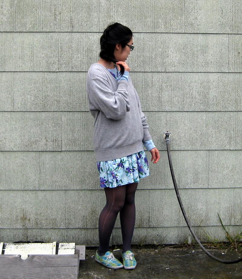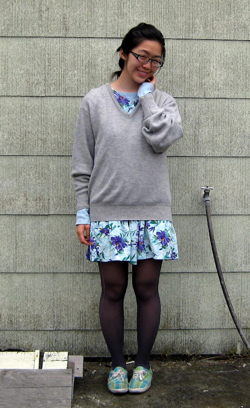 Sweater: uncle's. Light blue thermal: Old Navy, gift. Floral dress: Ross. Tights: DKNY. Plaid shoes: Keds.