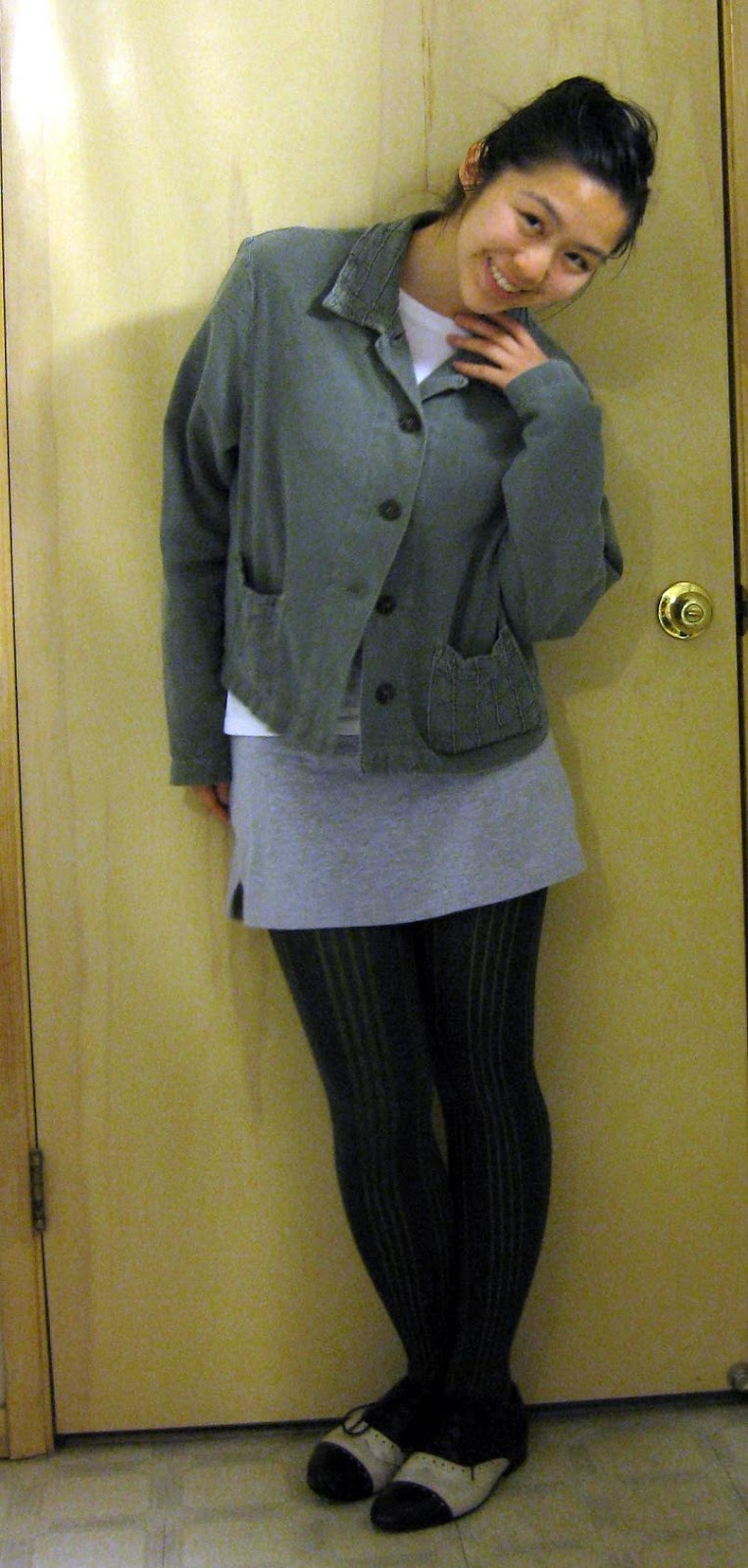 Jacket: mother's. White shirt: Target probably. Skirt: American Apparel, secondhand, gift. Tights: secondhand, gift. Black and white oxfords: Miz Mooz.