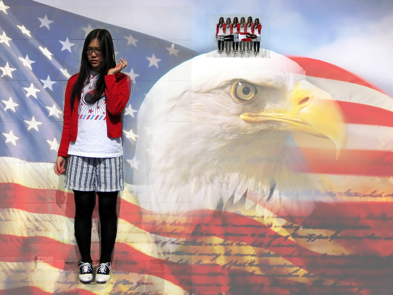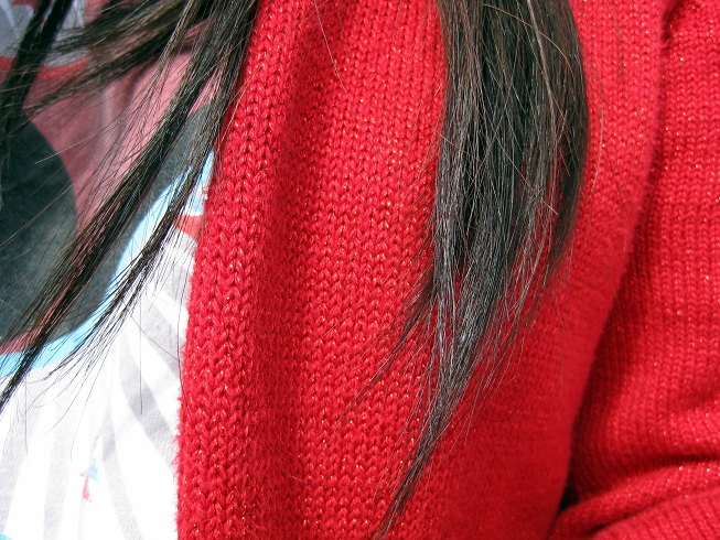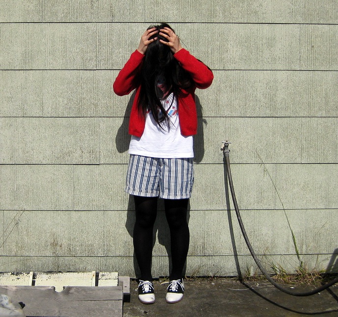 Sparkly red cardigan: Old Navy girl's. T-shirt: Old Navy men's. Striped shorts: aunt's, hand-me-down. Tights: generic. Saddle shoes: Payless.