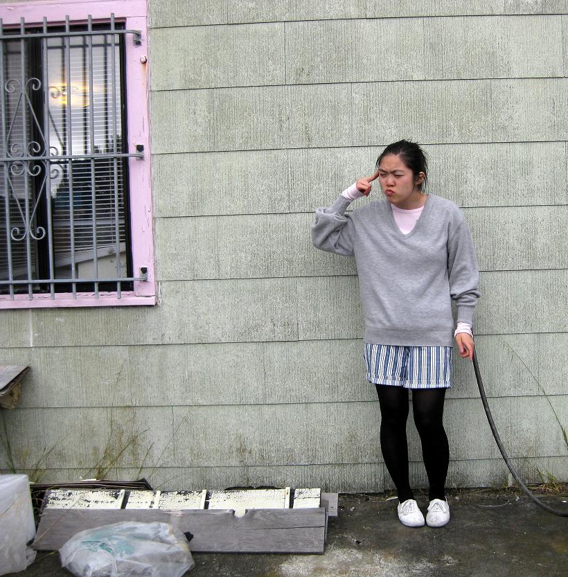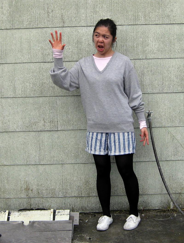 Sweater: uncle's, hand-me-down. Light pink thermal: Old Navy, gift. Shorts: aunt's, hand-me-down. Tights: generic. Fake Keds: Payless. Magneto helmet: MS Paint. Gaussian blur: image editing prowess.