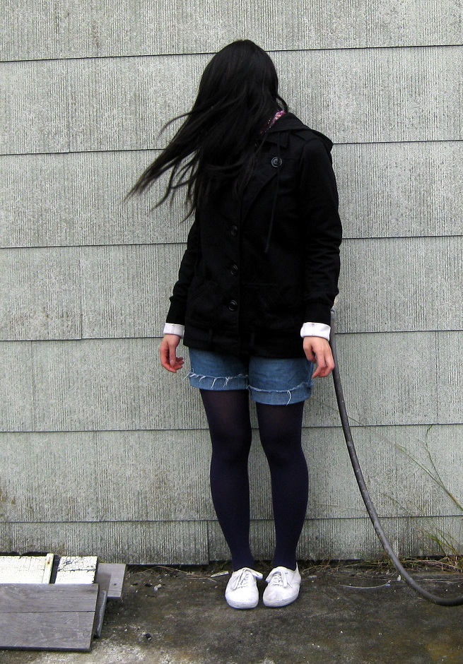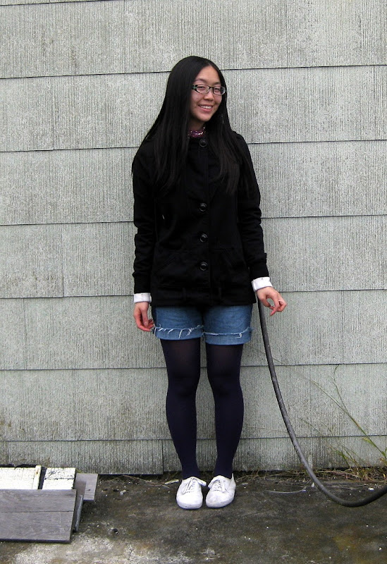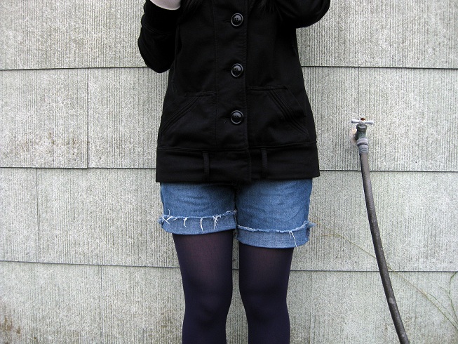 Denim shorts: mother's, Old Navy + scissors. Jacket: gift. Scarf: gift. Thermal peeking out: Kohl's. Tights: BP Nordstrom. Fake Keds worn within an inch of their lives: Payless.