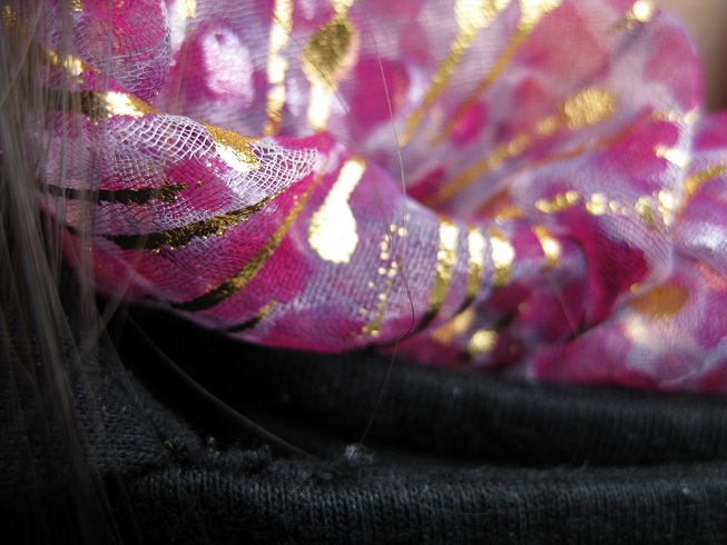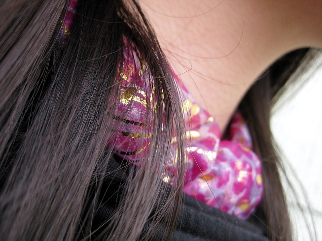 This pink scarf with metallic gold bits was a gift from Spenser's mom, probably from the day I went over to watch Doctor Who before the summer hiatus and was really, really disappointed (and charmed) by "A Good Man Goes To War."